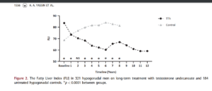 Para avaliar o acúmulo de gordura no fígado foi utilizado o Índice de Esteatose Hepática(FLI – sigla em inglês), calculado através de uma fórmula baseada na circunferência abdominal, IMC, triglicerídeos e gama-gt. Pode se observar no gráfico que o impacto sobre esse índice foi muito positivo para os pacientes em reposição de testosterona, principalmente no longo prazo.